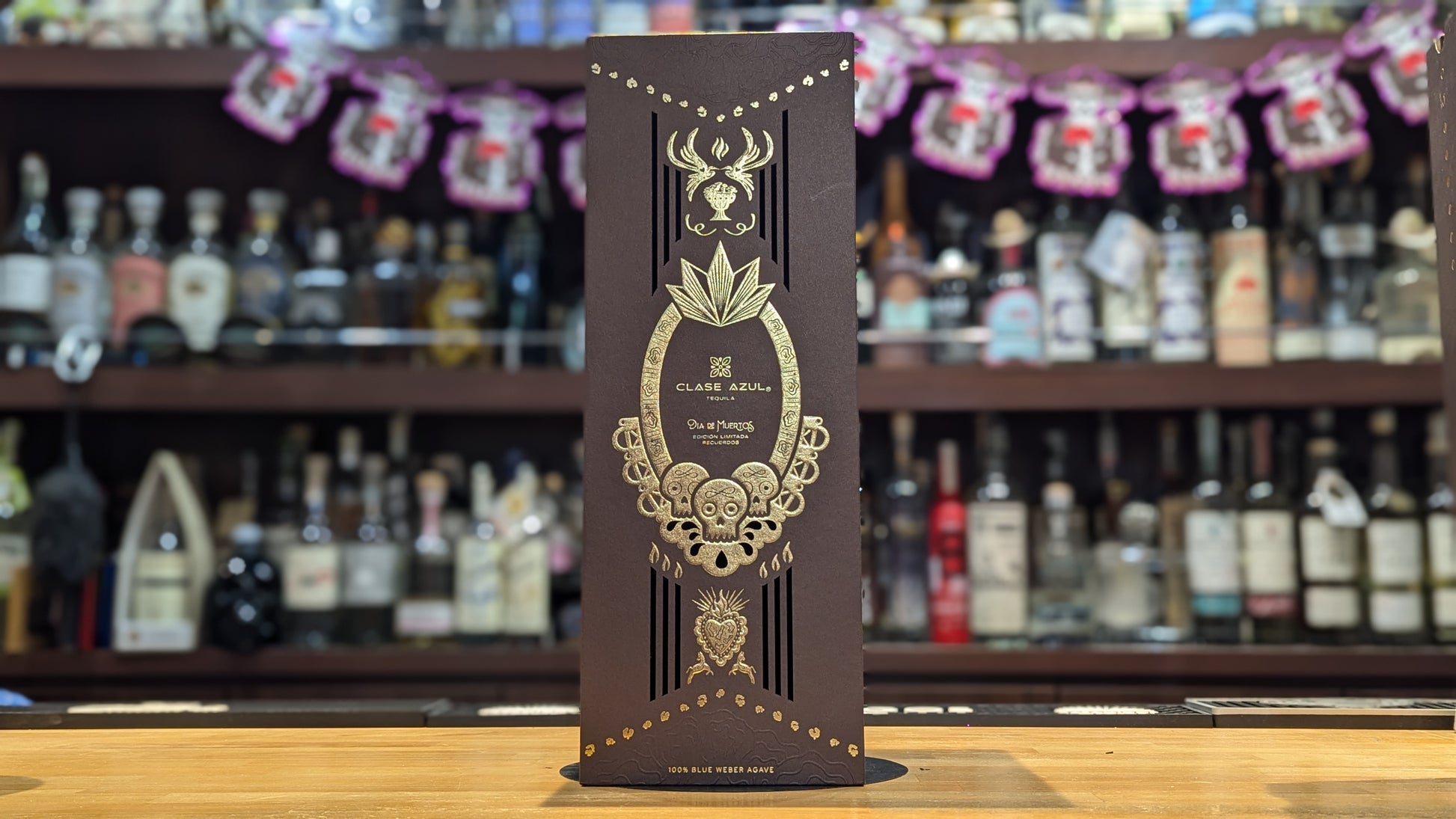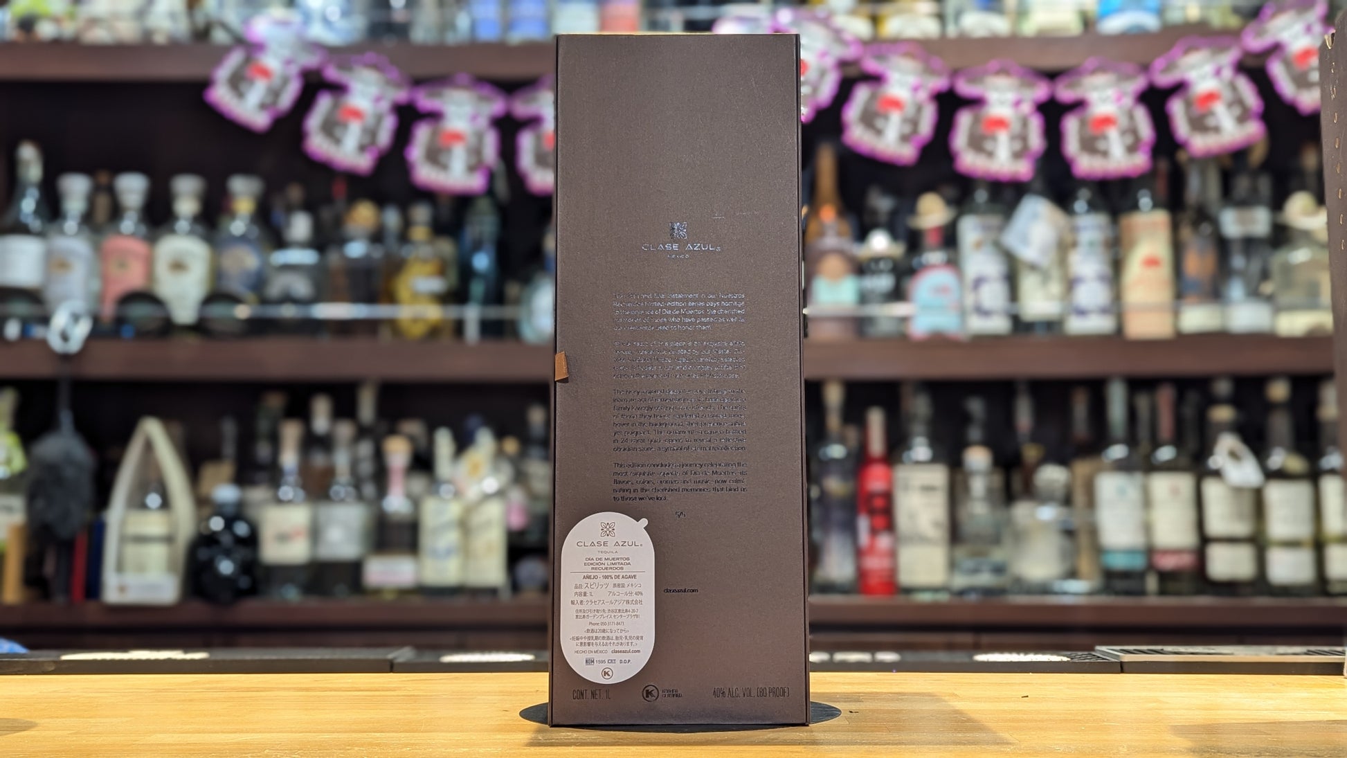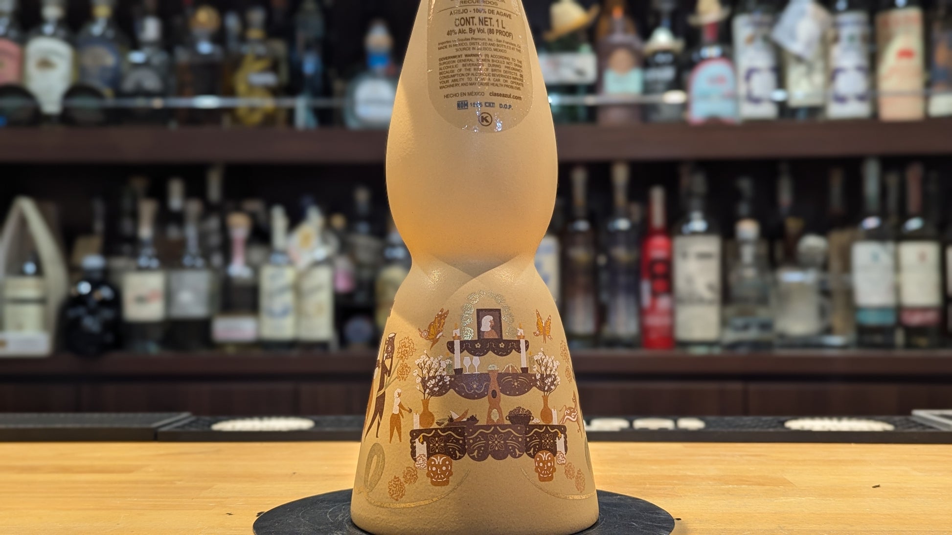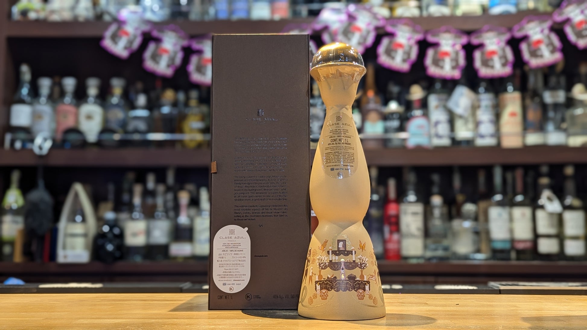 家族の手で丁寧に設えられた伝統的なオフレンダ(祭壇)が描かれ、マリーゴールドの花やパン・デ・ムエルトス、パぺル・ピカド、キャンドル、シュガースカル、そして限定版デキャンタのシルエットがモチーフとして配置されています。