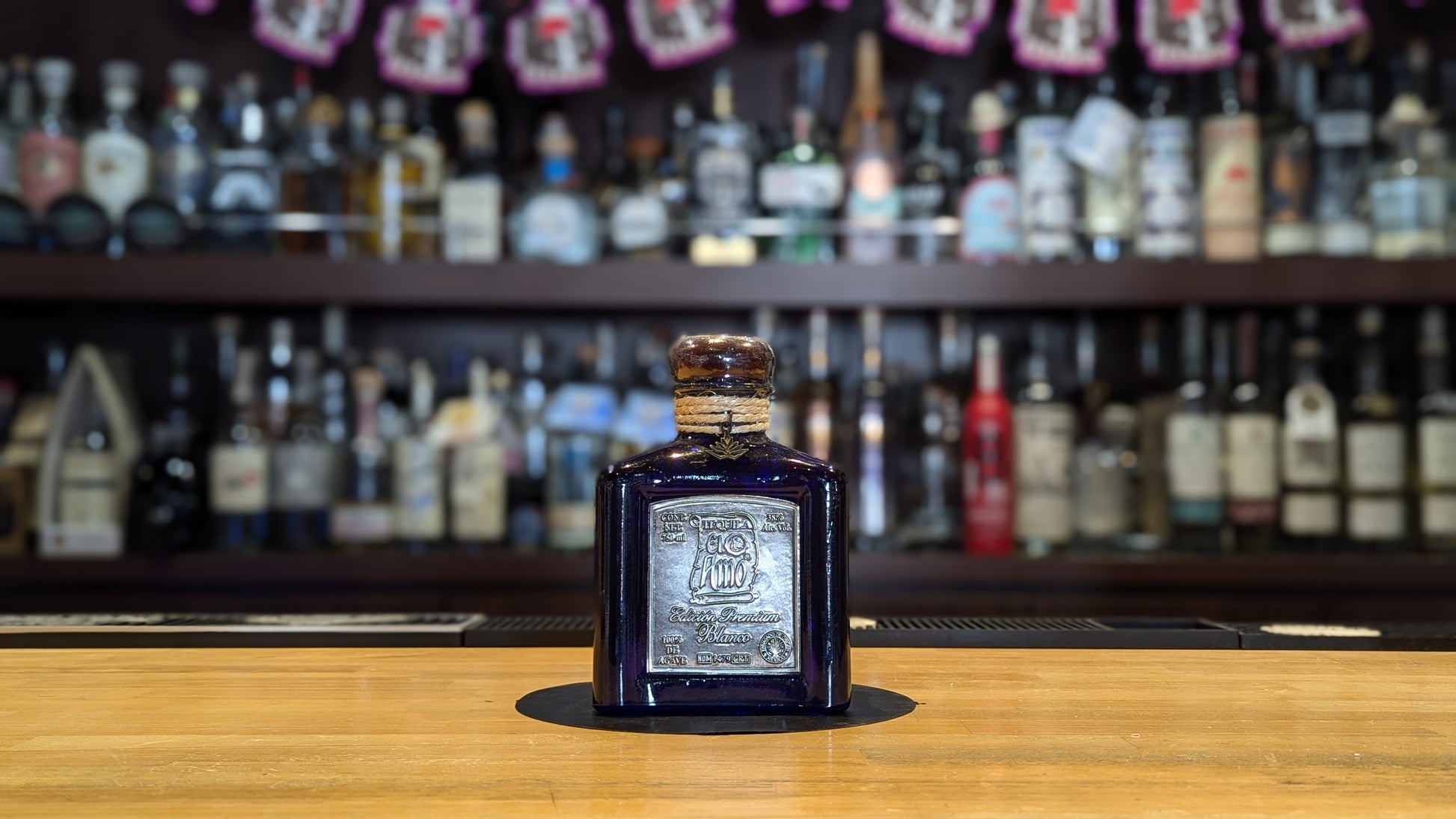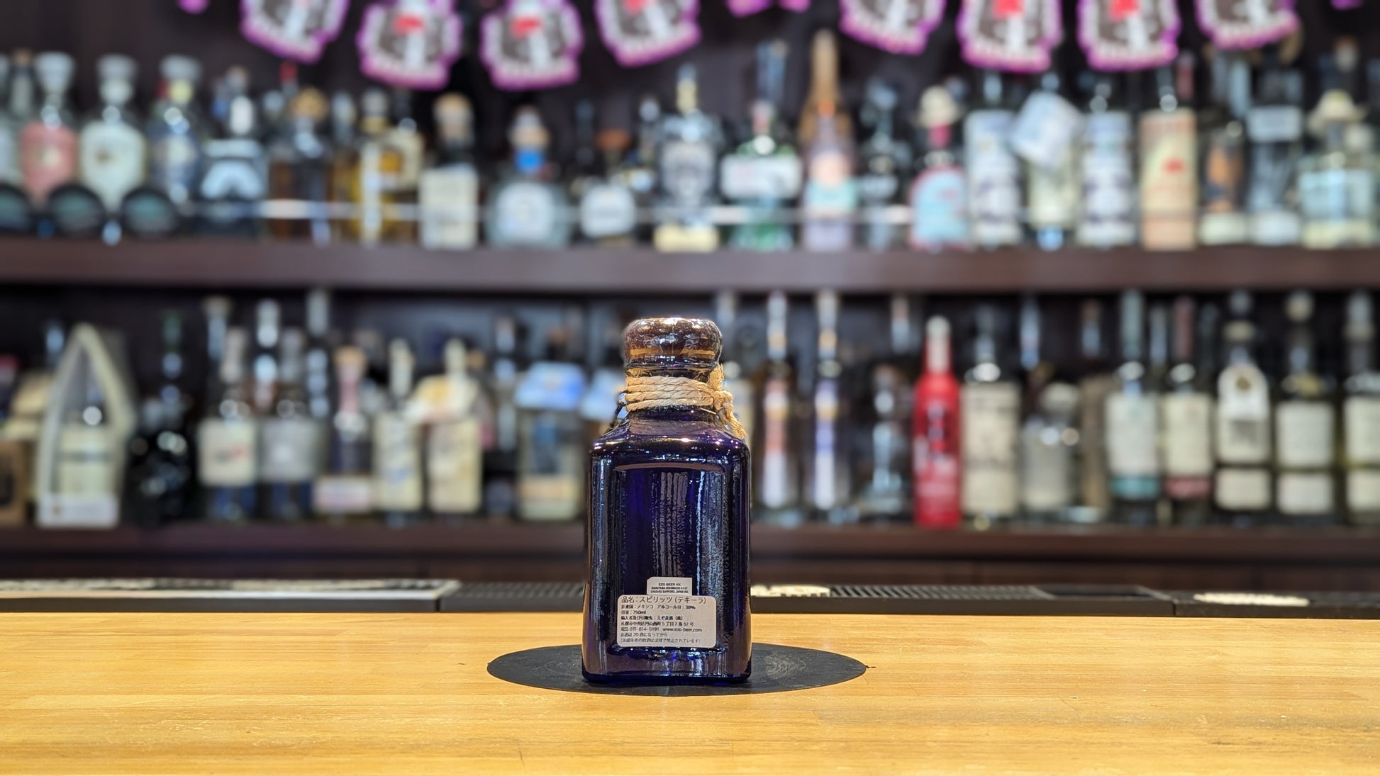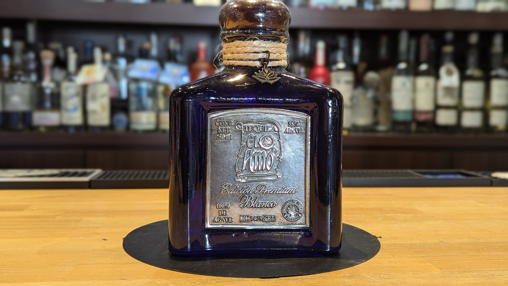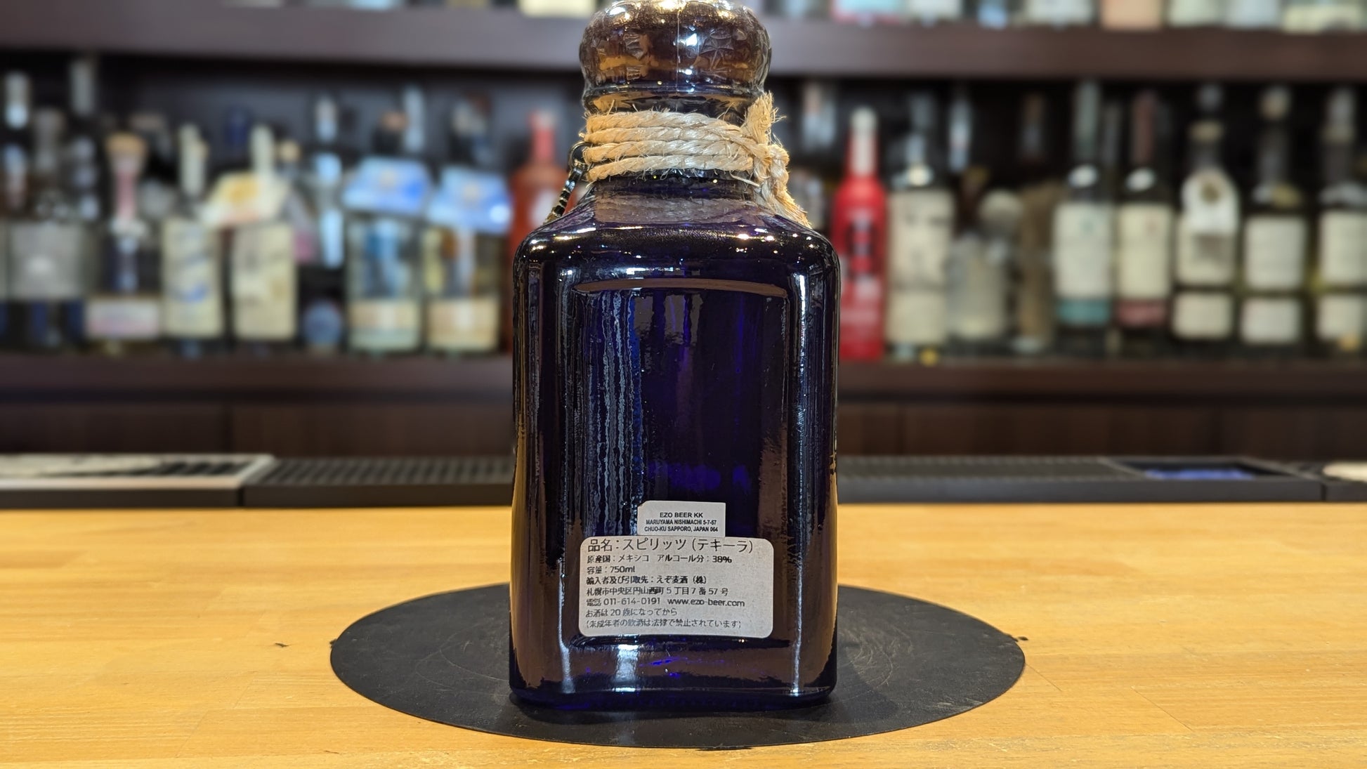 ブルーカラーの四角形ボトルには、ネック部分に紐でアガベ型のチャームが付いています。